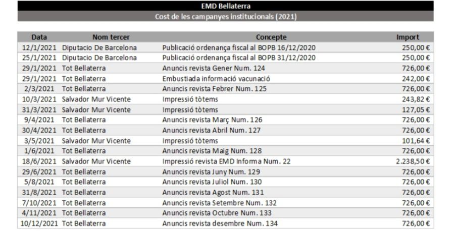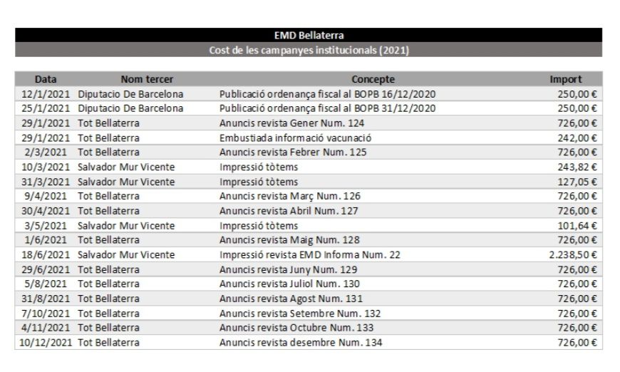 (23) Riba confirmar que l’anterior president de l’EMD pagava cada mes, 800€ a la revista mensual Tot Bellaterra, -en concepte de publicitat-, però juntament amb Macarulla no van voler respondre, sobre la quantitat que l’EMD paga actualment a l’empresa de premsa contractada a Sant Cugat, per molt que se li ha demanat, i en diferents ocasions, -sempre silenci com resposta-, el que ho fa molt poc transparent de cara al veïnat.
