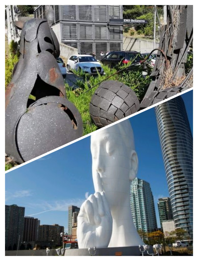 Una dona jove mira els gratacels de Manhattan i es posa un dit als llavis demanant silenci i L’Esquirol (1978) d’Emili Colom i Comerma, única escultura pública de Bellaterra està trista i en estat ruïnós mirant la seu del govern de Ramon Andreu perquè en 11 anys d’EMD no han trobat diners per restaurar-la