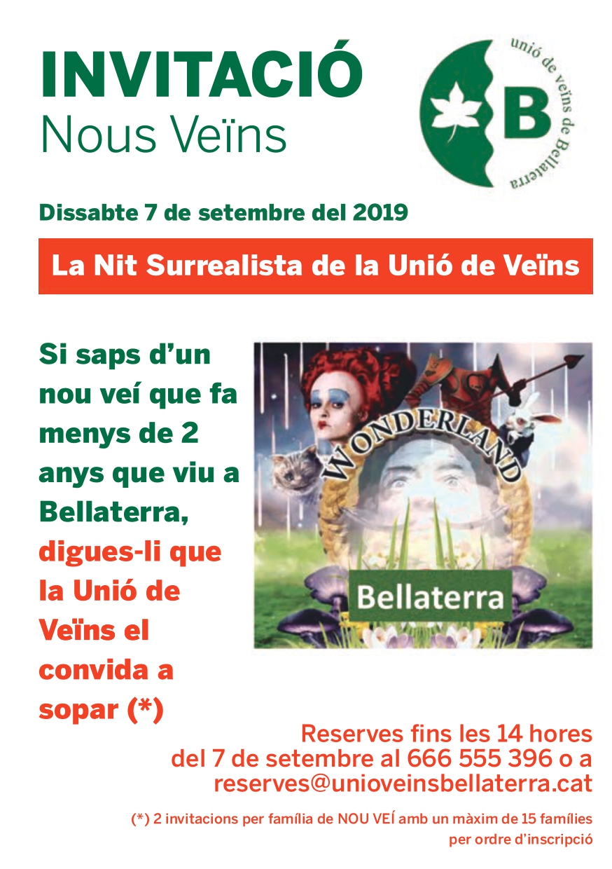 “La Unió de Veïns de Bellaterra, que té donats d’alta uns 160 veïns en pagament de cuota, s’ha reservat una partida de 240 euros del seu pressupost per cobrir el cost d’aquesta invitació de les noves veïnes i veins, coincidint amb la Festa Major de Bellaterra 2019”