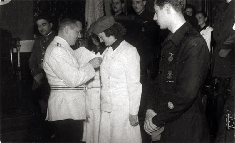 Després del lliurament dels retrats del Führer, Ehlers va imposar la Insígnia d’Honor de les Joventuts Hitlerianes a Marcet, a Riba, a Magda Coret, delegada comarcal de la Secció Femenina de la Falange, ia Montserrat Sampere, regidora comarcal de la secció femenina del Front de Joventuts i molt unida a la primera.