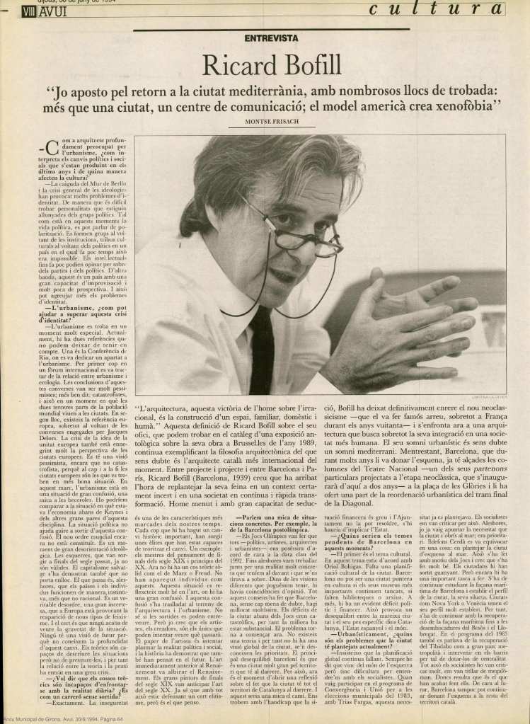 Lectura llarga sobre el pensament arquitectònic i urbanístic de Ricard Bofill, entrevista que Montse Frisach li va fer el 1994 a l’Avui. Interessant perquè albira temes que estàn de plena actualitat avui en dia. Tot un personatge.