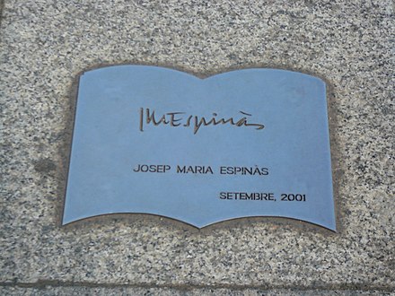 Placa amb la signatura de Josep Maria Espinàs al monument al llibre (Barcelona)