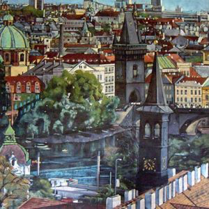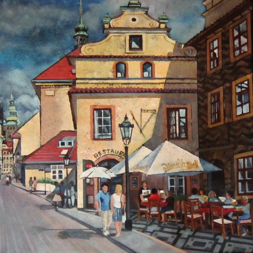 A l’exposició, les vistes de la ciutat on nasqué Kafka, inclòs el cafè que duu el nom del compositor Smetana, es combinen amb quadres on hi apareixen les barcelonines pla- ces Reial i del Pi, com també una perspectiva de la Punta de Sitges, i és que la nostra artista sap entrelligar paisatges txecs i catalans mitjançant l’element comú de la civilitat, a través de la reivindicació del carrer com a àgora pública on els ciutadans s’interrala- cionen i fan vida sota el principi del respecte mutu.