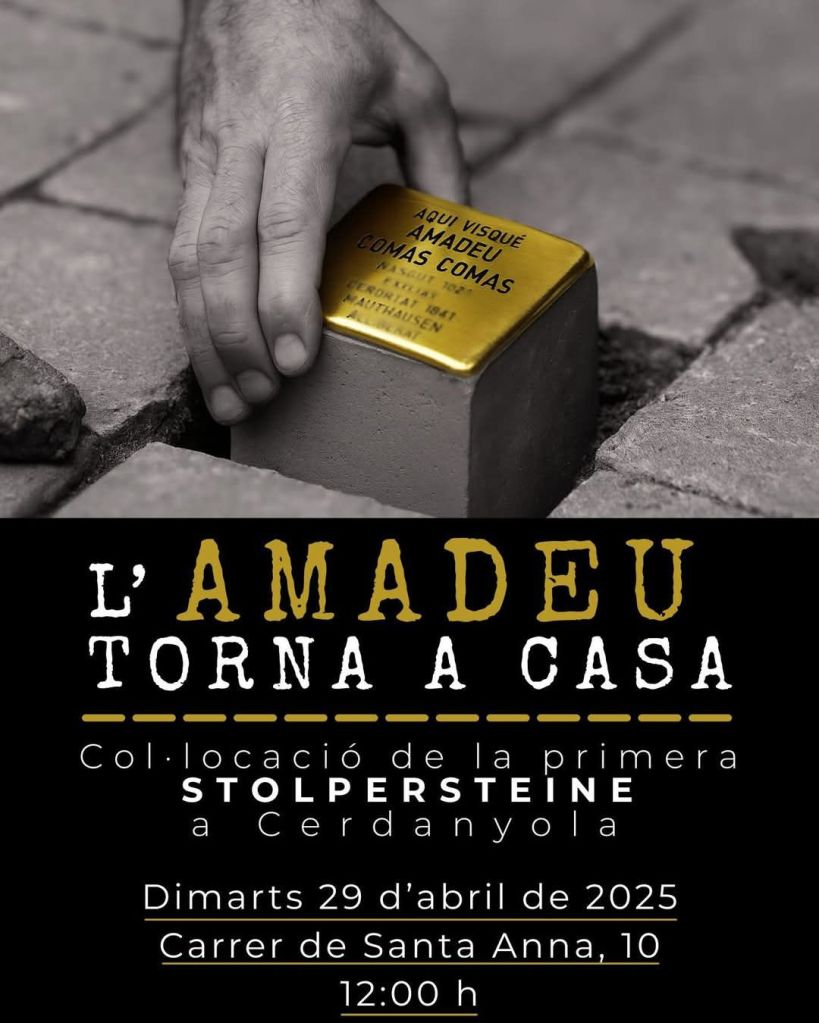 “El dimarts 29 d’abril a les 12 h, al carrer Santa Anna número 10, es farà l’acte de col·locació d’una llamborda Stolpersteine en record del cerdanyolenc Amadeu Comas Comas, deportat al camp d’extermini nazi de Mauthausen – Gusen“