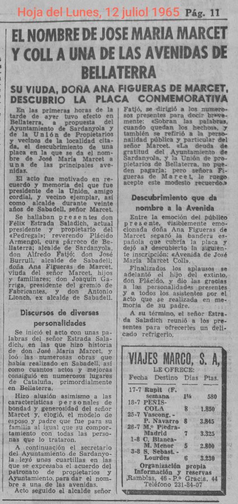 “Junts també se suma a les veus que reclamen la retirada de Bellaterra del monòlit i el nom del carrer a Josep Maria Marcet, alcalde de Sabadell durant el franquisme, en compliment de la Llei de Memòria Democràtica.”