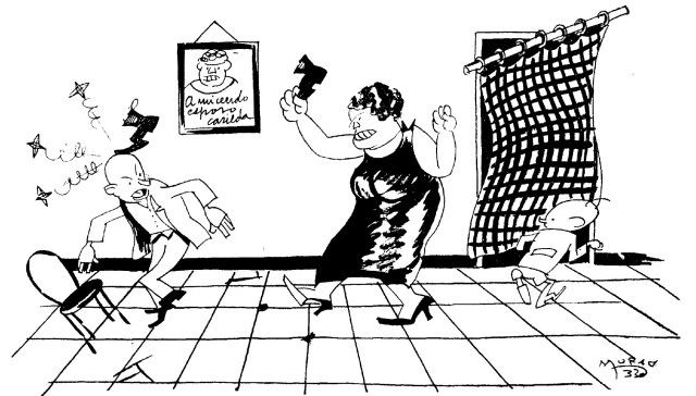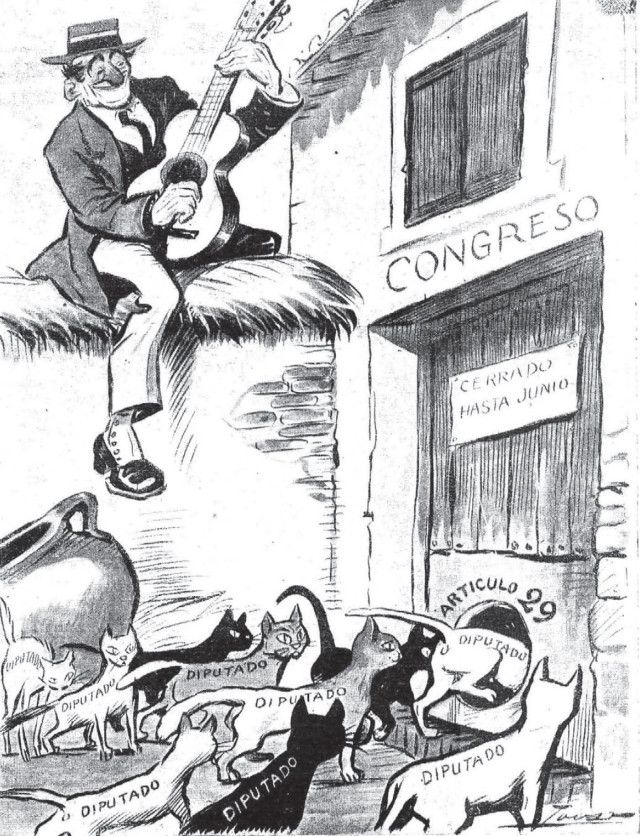 Amb el títol Música nova amb lletra vella veiem un munt de gats-diputats entrant per una gatera del Congrés denominada Article 29. La imatge del frau es completa amb una olla gegant al costat dels gats que al·ludeix a la tupinada. Als anys 20 i 30 Gutiérrez, la gran revista d?humor de l?època, contribuirà a suavitzar les tensions socials arrencant somriures amb la seva sornegueria a tot l?espectre polític. Era un humor lleuger, enginyós, amable i amb espurna que fugia del sarcasme i la confrontació. Un exemple d’això és aquesta caricatura publicada l’abril de 1933 titulada Discutint el vot en què una dona llança la bota al seu marit, que fugint per la casa li diu que li ha demanat el vot i no la bota. L’acudit s’aprecia millor sabent que aquell mateix any les dones votarien per primer cop a Espanya.