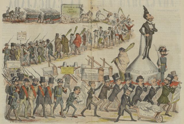 Al capdavant de la desfilada, portada a les espatlles pels beneficiats del sistema i pujada a un embut que simbolitza el cribratge dels vots, veiem Sagasta en la primera i breu etapa en què es va aplicar el sufragi universal masculí. Empenyent un carretó ple de paperetes apareix un dels addictes al poder. Porta la inscripció vots a lengròs, al·ludint a la compra de vots. Un altre porta sobre el cap una caixa plena de paperetes; és l’urna ja arreglada abans de començar la votació. Un altre porta una taula plegable amb els gobelets i els daus de triler. Veiem els candidats i electors de l’oposició detinguts i apallissats, mentre que la Guàrdia Civil i l’Exèrcit garanteixen l’ordre amb la seva presència. Cap al final de la caricatura també es veu un carro amb la llegenda: dipòsit de vots per a Lázaros, cosa que necessita un aclariment. És una al·lusió al vot dels morts, una altra de les trampes utilitzades per inflar els resultats al gust desitjat. Eren anomenats Llàtzers per analogia amb el Llàtzer de l’Evangeli que ressuscitava. També es deia així als candidats del Govern que eren derrotats a les urnes i se’ls ressuscitava falsificant les actes. Referint-se a aquesta segona accepció el diari La Discussió va fer un irònic comentari el 1871: Els diputats a qui nosaltres anomenàvem Llàtzers no van poder ser ressuscitats perquè no van morir, i no van morir perquè la mort suposa la vida, i aquells senyors mai la van tenir com a diputats, perquè mai fossin tals sense la facultat creadora del Govern, que els va formar del fang de les urnes, com Déu a Adam del fang de la terra, segons de manera que, amb més propietat que Llàtzer, els hauríem anomenat Adanes. Pel que fa al vot dels morts pròpiament dit, el diari satíric Gil Blas deia el següent el 1871 comentant les eleccions recents: Molts afirmen que a Madrid han votat fins a dos-cents quaranta difunts… Això demostrarà només que fins i tot aquest segle de corrupció i descreïment solen reproduir-se els miracles; però miracles de veritat, autèntics, vivits, i no aquestes paròdies de miracles, aquests miracles de tres al quart, com la sang que es liquida o el Crist que sua… Els difunts surten de les tombes per recolzar el ministeri; això, a més de provar-ne la bondat relativa, és edificant. Un altre diari satíric i anticlerical, El Motín, va publicar un expressiu dibuix el 1884 amb els morts sortint de les seves sepultures per anar a votar. El gravat porta el títol rotund: Abans de la batalla electoral. Aixecar morts