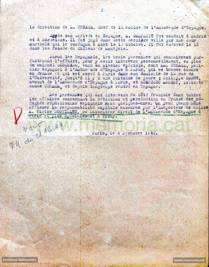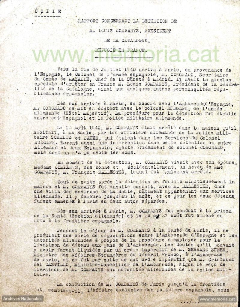 L’informe indica amb claredat que el trasllat de Lluís Companys fins Espanya fou obra exclusiva de la policia espanyola, sota direcció de Pedro Urraca.