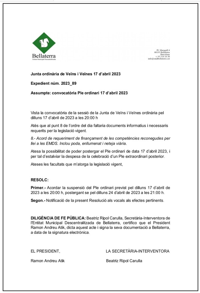 AGENDA BELLATERRA| Desconvocat el Ple de Bellaterra, 17 abril 2023