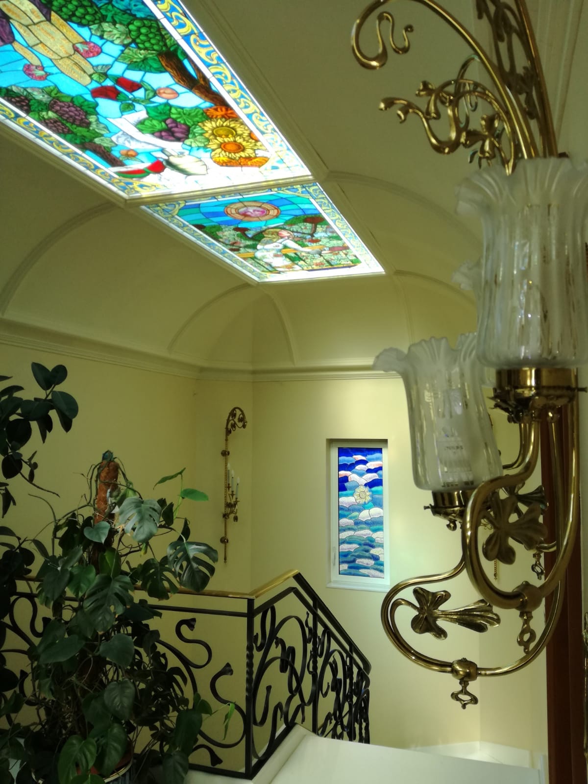 El vitrall modernista de grans dimensions, és la nineta dels ulls de la casa. Obra d’Antoni Bordalba (Barcelona, ?-1925), Vidrier modernista català format al taller d’Antoni Rigalt i Blanch. Ben aviat es va establir pel seu compte i del taller van sortir obres d’una gran qualitat. Els més importants són els vitralls que va realitzar per al Cercle del Liceu, sota la direcció d’Oleguer Junyent i amb dibuixos de Josep Pey. En aquests vitralls de tema wagnerià mostra un gran domini del dibuix de la grisalla i especialment un ús molt abundant del vidre anomenat americà o Tiffany.