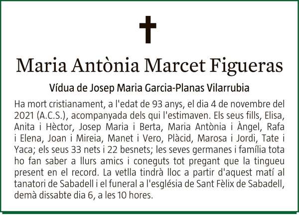 Des de la seva terrassa, la guapíssima senyora Garcia Planas, mirava amb el seu gran somriure tots els nens del poble que érem tots part de la seva família. A l’estiu per Binibeca, a l’hivern per Bellaterra, sempre Cuidava un i altre com si fos els seus fills. Fantàstica companya de Josep Maria, mare de més de deu nens, també tenia el cor i l’energia per a cadascun de nosaltres. A vosté estimada senyora, li dono les gràcies per la força d’afecte que ens donava a tots. Marc Lajeunesse (París)