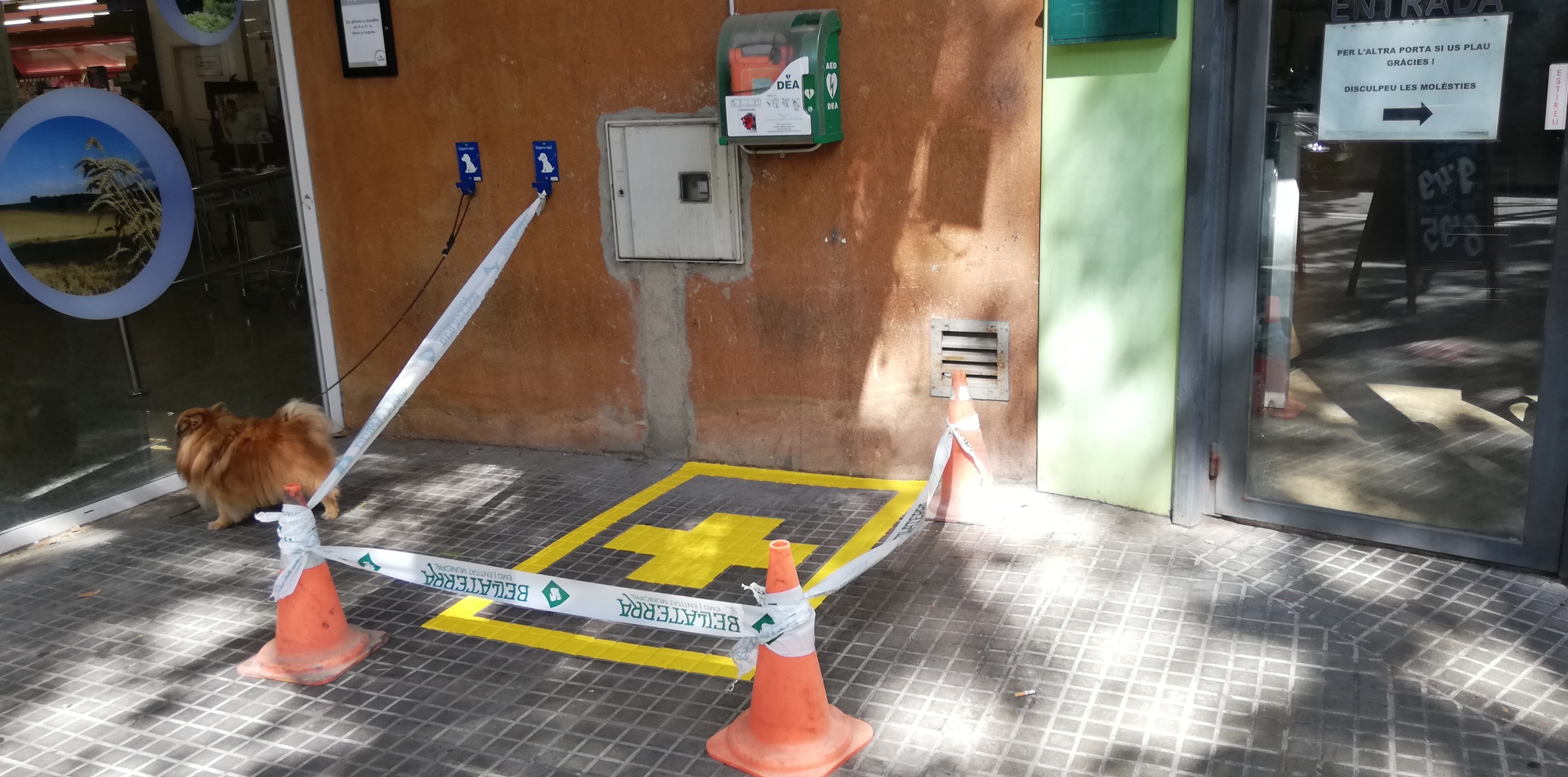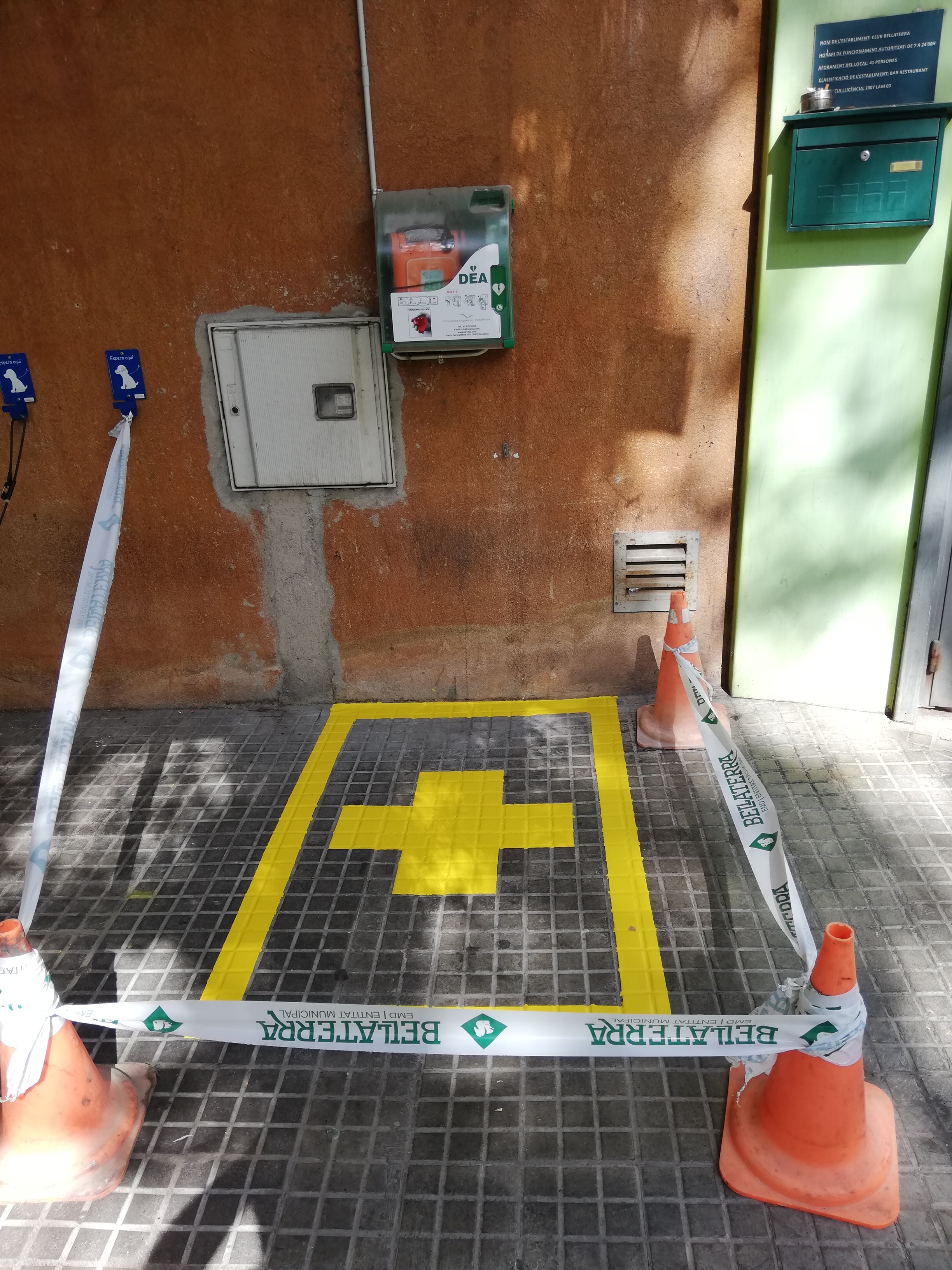 Bellaterra. Cat porta anys reclamant que el Desfibril-lador situat al costat del Condis i Bar del Club, sigui canviat a un lloc més visible des de l’estació dels FGC, però finalment , tot i que últimament es respectava una mica més l’espai situat a la paret del Club, avui divendres, La Brigada de l’EMD de Bellaterra, ha senyalitzat a terra, l’espai reservat pel desfibrilador, i evitar estigui bloquejat amb cadires i taules del bar.