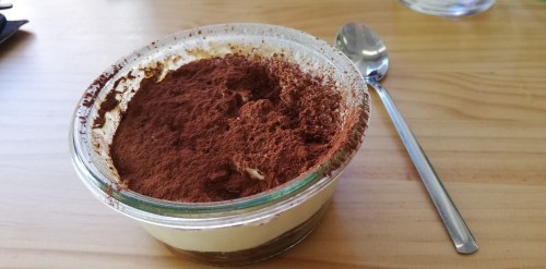 Boníssim el Tiramisú casolà servit en un petit bol amb el seu lleuger toc d’Amareto. El forn de pedra està a la vista al mig de la mateixa sala, donant autenticitat i un ambient més càlid al menjador.