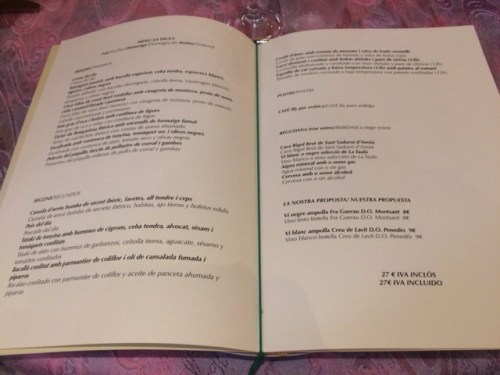 Un restaurant amb patró determina una clientela que se sent com a casa i una confiança per part de la cuina de cara a confeccionar-nos un Menú Degustació La Taula compost per 3 primers i 1 segon a escollir, més postres, beguda i el millor cafè aràbiga del món, Illy Caffè, creat a Trieste per Françesco Illy, nascut a la ciutat de Timisoara, del Banat de Romania. Aquest menú és una oferta a la qual aconsellem apuntar-se sense la més mínima vacil-lació, tenint com a única precaució d’escollir entre el Cava Brut Rigol Artesà de Sant Sadurní d’Anoia o els vins recomanats.