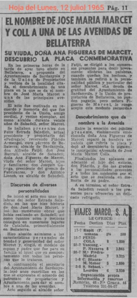 LLUIS TORRES✍️Després de 60 anys, de quan Domingo Fatjó Sanmiquel, (alcalde franquista de Cerdanyola del Vallès, de 1959 a 1976), el 12 de juliol de 1965 va inaugurar, amb la família i uns veïns de Bellaterra, el monòlit de la Plaça del Pi i placa de l’Avinguda Josep Maria Marcet, (alcalde franquista de Sabadell 1940-1960). Així ho publicava aquell dia al diari Hola del Lunes, que avui compartim.